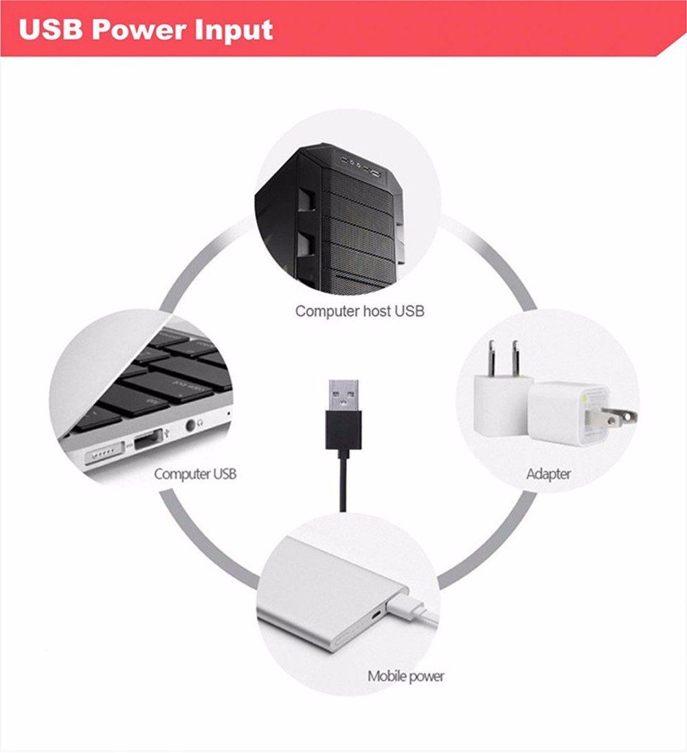 Technical parameters: Input voltage: 4.2-4.8V // Power input: Computer, 4.5V power supply, or batteries // Output power: 2-2.5W // Output voltage: 5V // Light source: LED Bulbs.